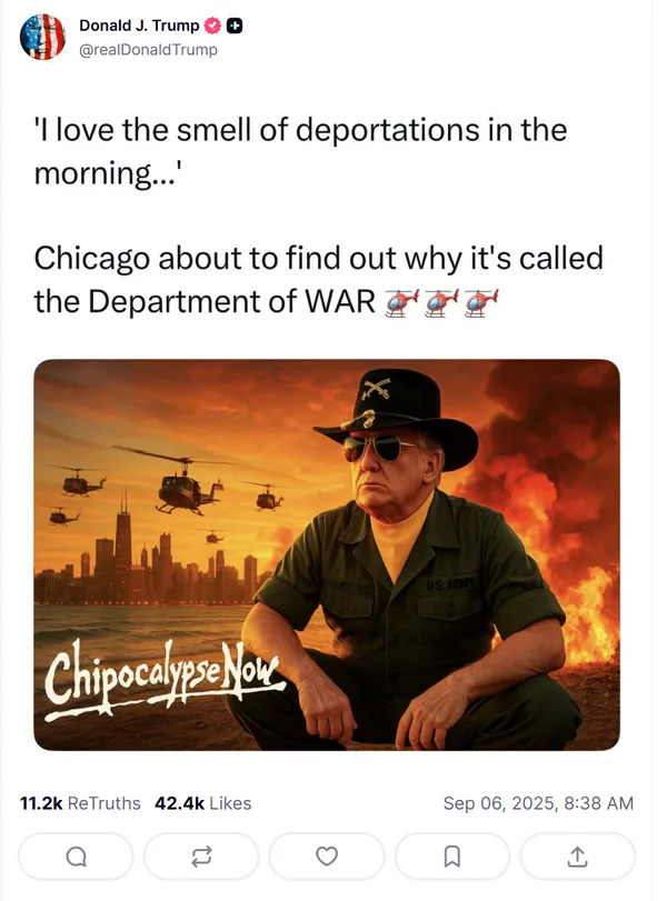 On September 6th, Trump posted a picture of himself on social media as the fictitious battle-crazed colonel from the movie “Apocalypse Now”, with the words “Chipocalypse Now” and the caption “I love the smell of deportations in the morning… Chicago about to find out why it’s called the Department of WAR”. In the background is the Chicago skyline, apparently in flames.